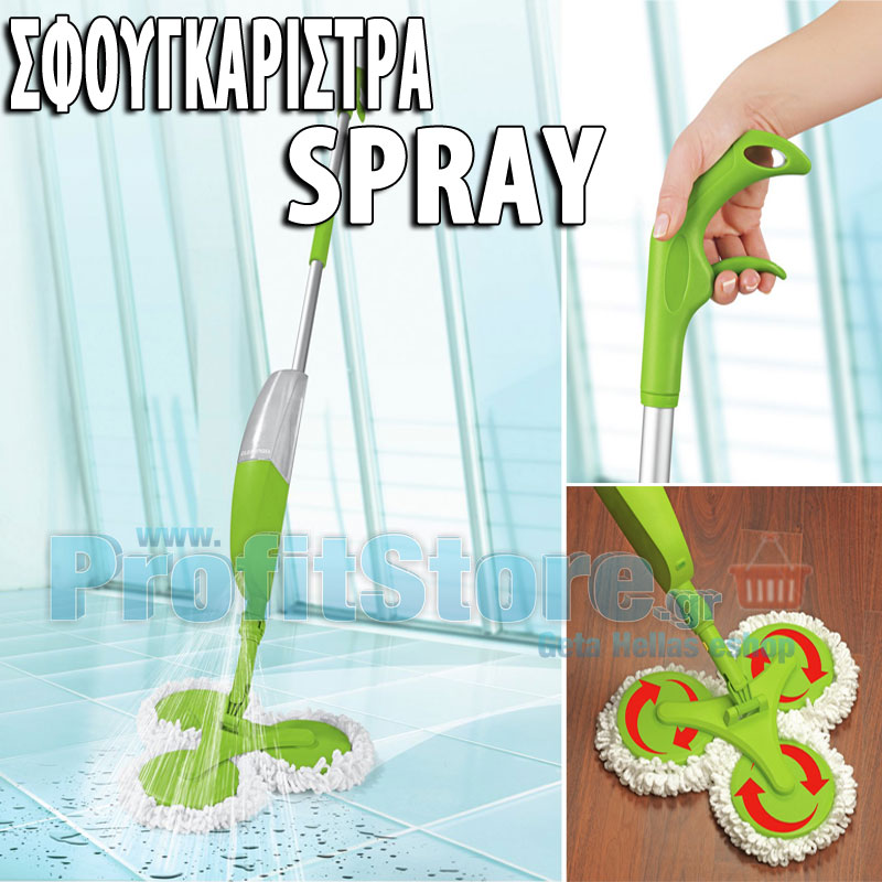 Σπρέι σφουγγαρίστρα - σκούπα, με Microfiber ( μικροϊνες ) και ενσωματωμένο δοχείο ψεκασμού. Διαθέτει 3 περιστρεφόμενες 360 ° κεφαλές με ανεξάρτητα πανάκια για να καθαρίζετε κάθε γωνία, έπιπλο και κάθε σημείο του σπιτιού!