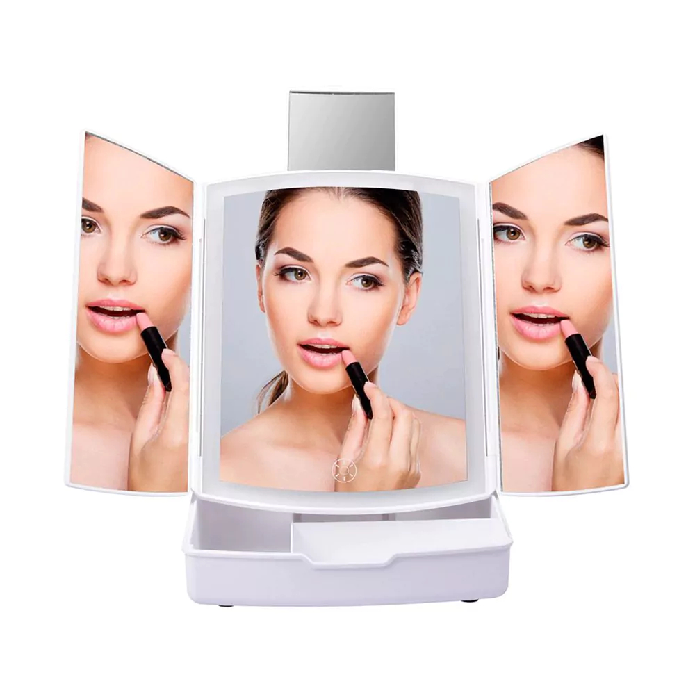 Αυτός ο λευκός καθρέφτης προσφέρει τρεις επιφάνειες, επιτρέποντάς σας να δείτε το πρόσωπό σας από διάφορες γωνίες για ακριβή εφαρμογή μακιγιάζ.