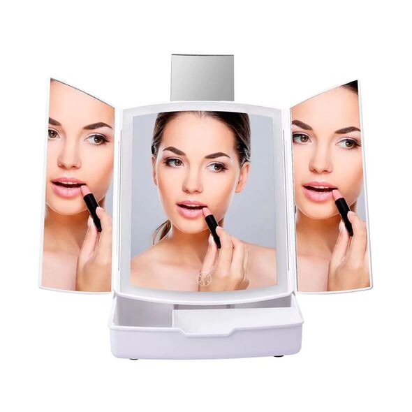 Αναβαθμίστε την εμπειρία του μακιγιάζ σας με τον τρίπλευρο καθρέφτη 5x μεγέθυνσης, εξοπλισμένο με φωτισμό LED και αποθηκευτικό χώρο.