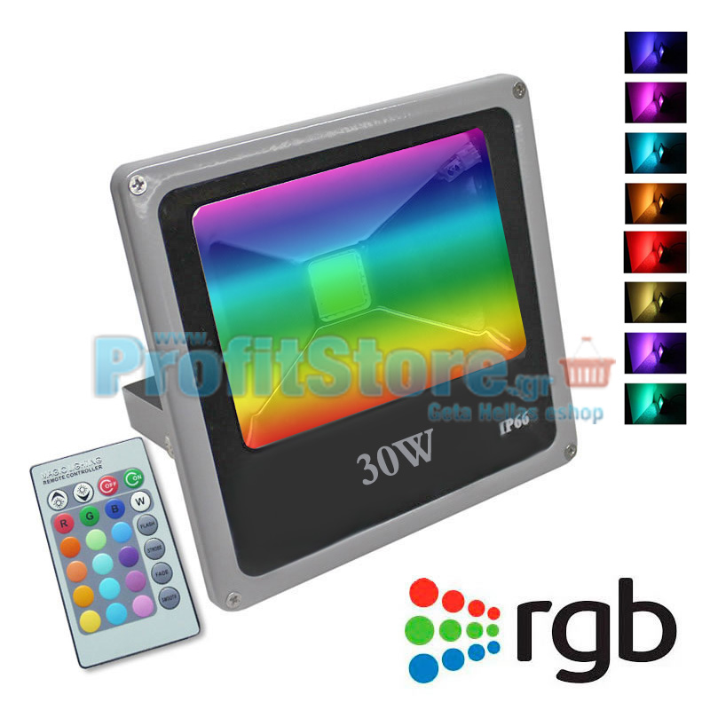 RGB Προβολέας 30Watt, για εξοικονόμηση ενέργειας και ατμοσφαιρικό φωτισμό μαζί με ασύρματο τηλεχειριστήριο για αυτόματη εναλλαγή άπειρων αποχρώσεων.