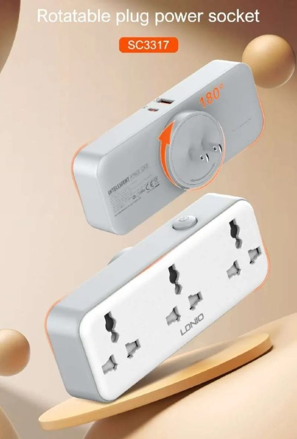 Περιστρεφόμενο universal πολύπριζο 3 θέσεων με USB-C PD και USB-A QC 3.0 έως 30W. Ιδανικό για γραφείο ή σπίτι, προσφέρει ευέλικτη τοποθέτηση, ασφαλή λειτουργία και γρήγορη φόρτιση πολλαπλών συσκευών σε μία compact και πρακτική σχεδίαση.