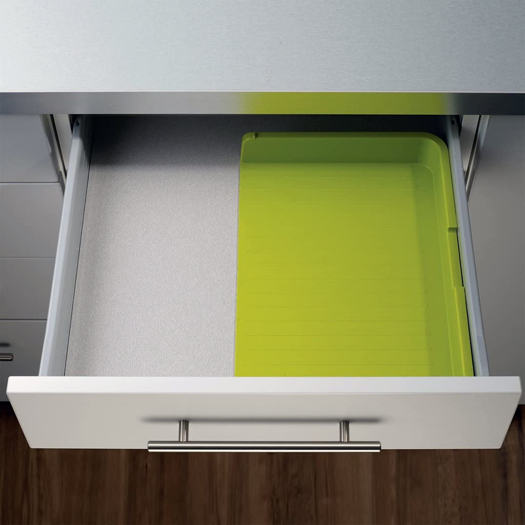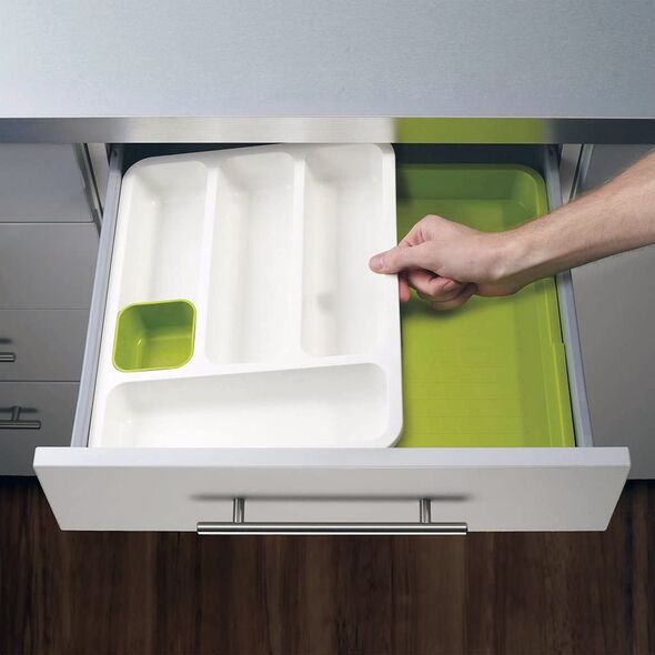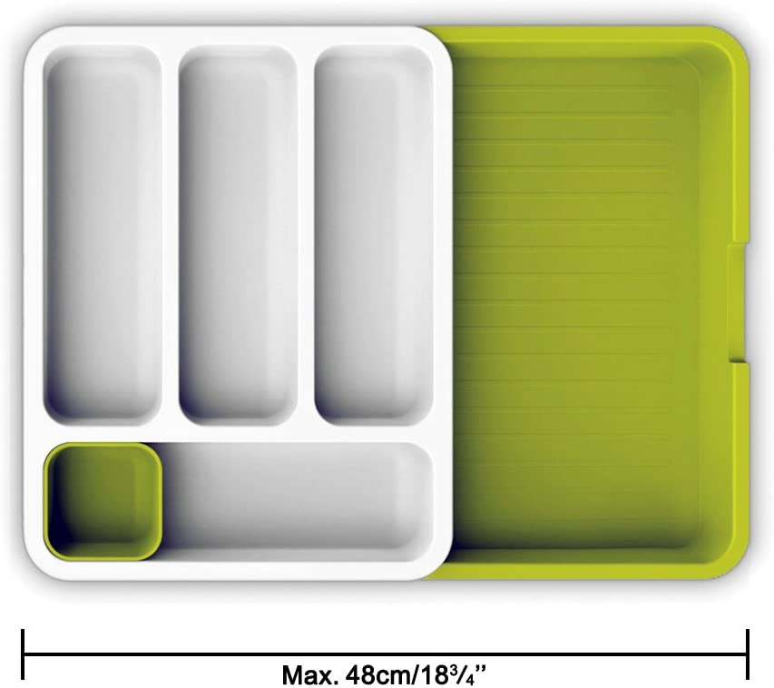 Εφαρμόζει σε κάθε συρτάρι! Τα δύο μισά του δίσκου μπορούν να ρυθμιστούν λεπτομερώς ώστε να ταιριάζουν σε διάφορα μεγέθη συρταριού από 29 cm έως 48 cm και να κλειδώνουν με ασφάλεια σε σταθερή θέση.