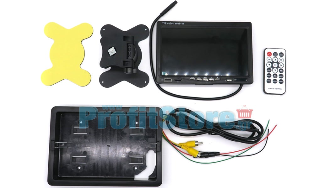 - Στη συσκευασία περιλαμβάνονται: monitor 7", τηλεχειριστήριο, βάση στήριξης, πλαίσιο, αυτοκόλλητο για την βάση, καλώδιο σύνδεσης RCA & τροφοδοσίας
