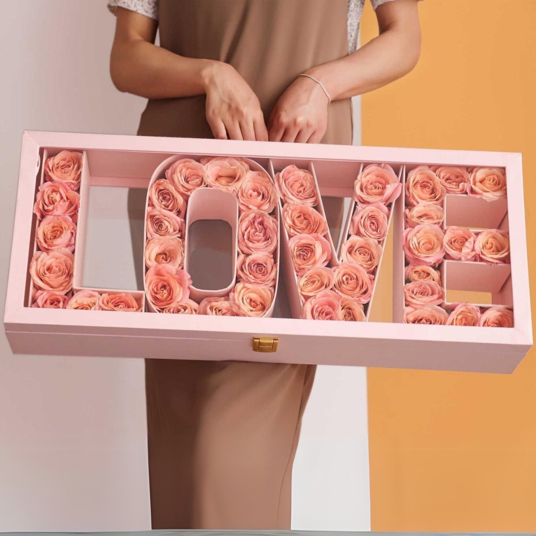 Το εσωτερικό του περιλαμβάνει ροζ τεχνητά τριαντάφυλλα υψηλής ποιότητας, διατεταγμένα έτσι ώστε να σχηματίζουν τη λέξη "LOVE".