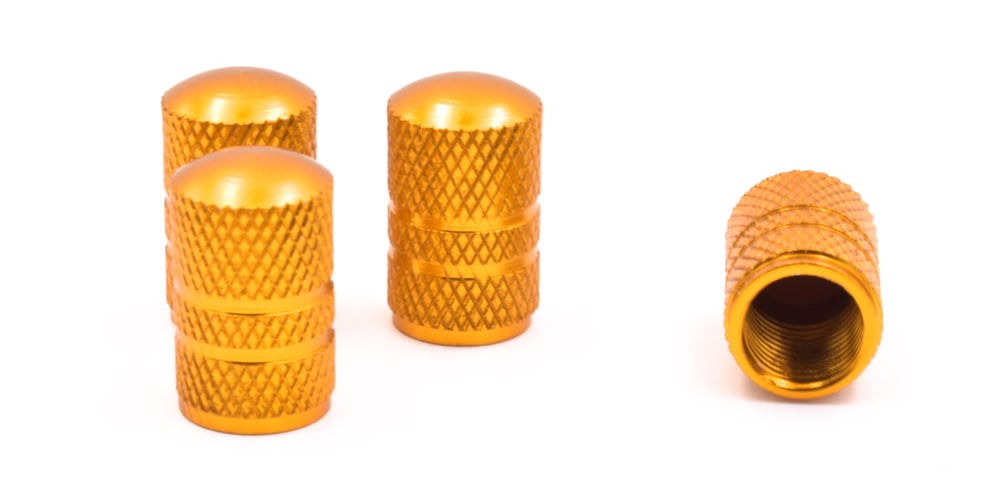 Βαλβίδες αλουμινίου για ελαστικά αυτοκινήτου και μηχανής σε πορτοκαλί χρώμα.