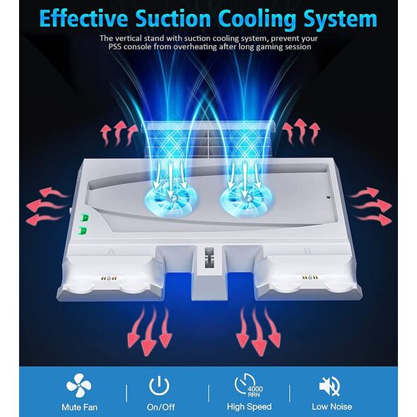 Η βάση έχει ενσωματωμένα 2 ανεμιστηράκια χαμηλού θορύβου που ρουφούν τον ζεστό αέρα από το κάτω μέρος της κονσόλας και διαχέει τη θερμότητα προς όλες τις κατευθύνσεις για να μεγιστοποιήσει τη διάρκεια ζωής του αγαπημένου σας PS5!
