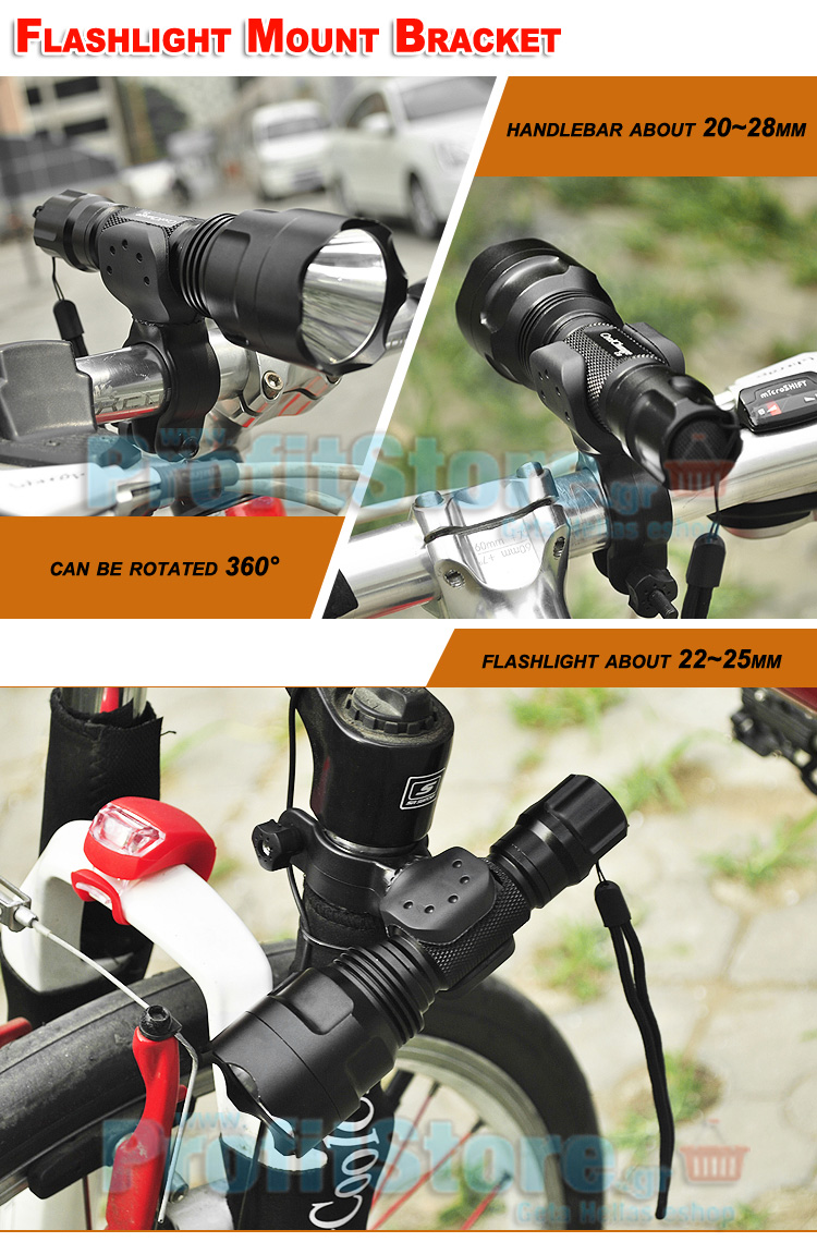 - Ειδική βάση/σφυκτήρας για την προσαρμογή φακού σε τιμόνι ποδηλάτου ή σε όπλο.
