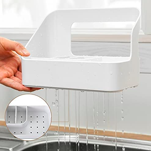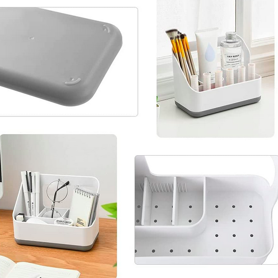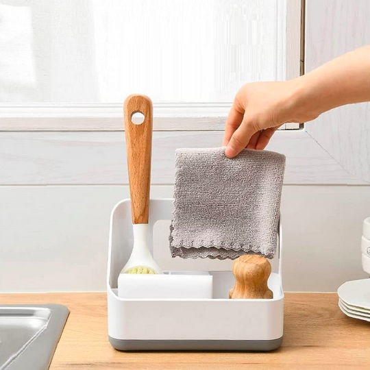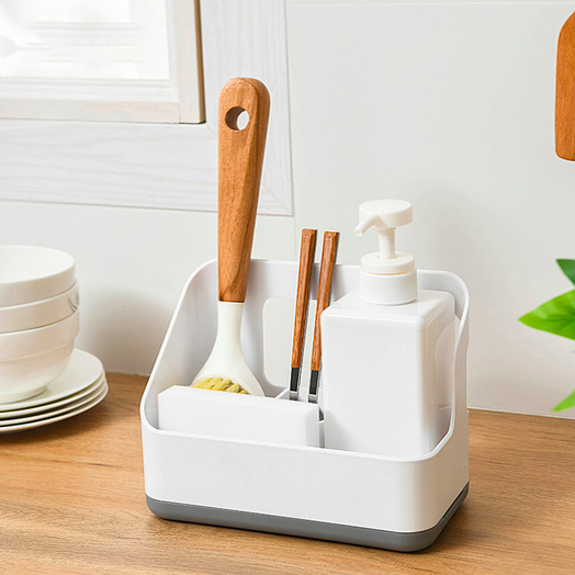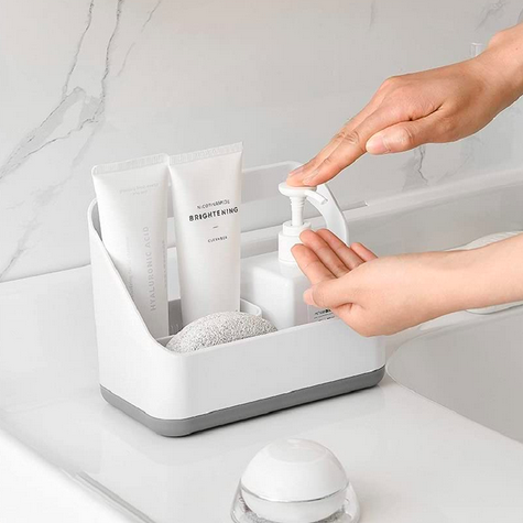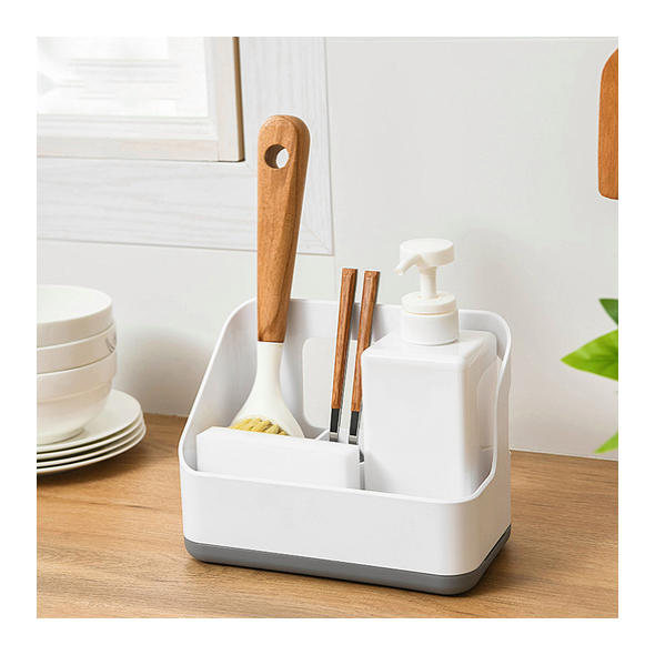 Πλαστική βάση οργάνωσης για τον νεροχύτη της κουζίνας ή τον νιπτήρα του μπάνιου, με 3 μικρές θήκες και μία μεγάλη, που θα σας βοηθήσει να εξοικονομήσετε χώρο εύκολα και υγιεινά.