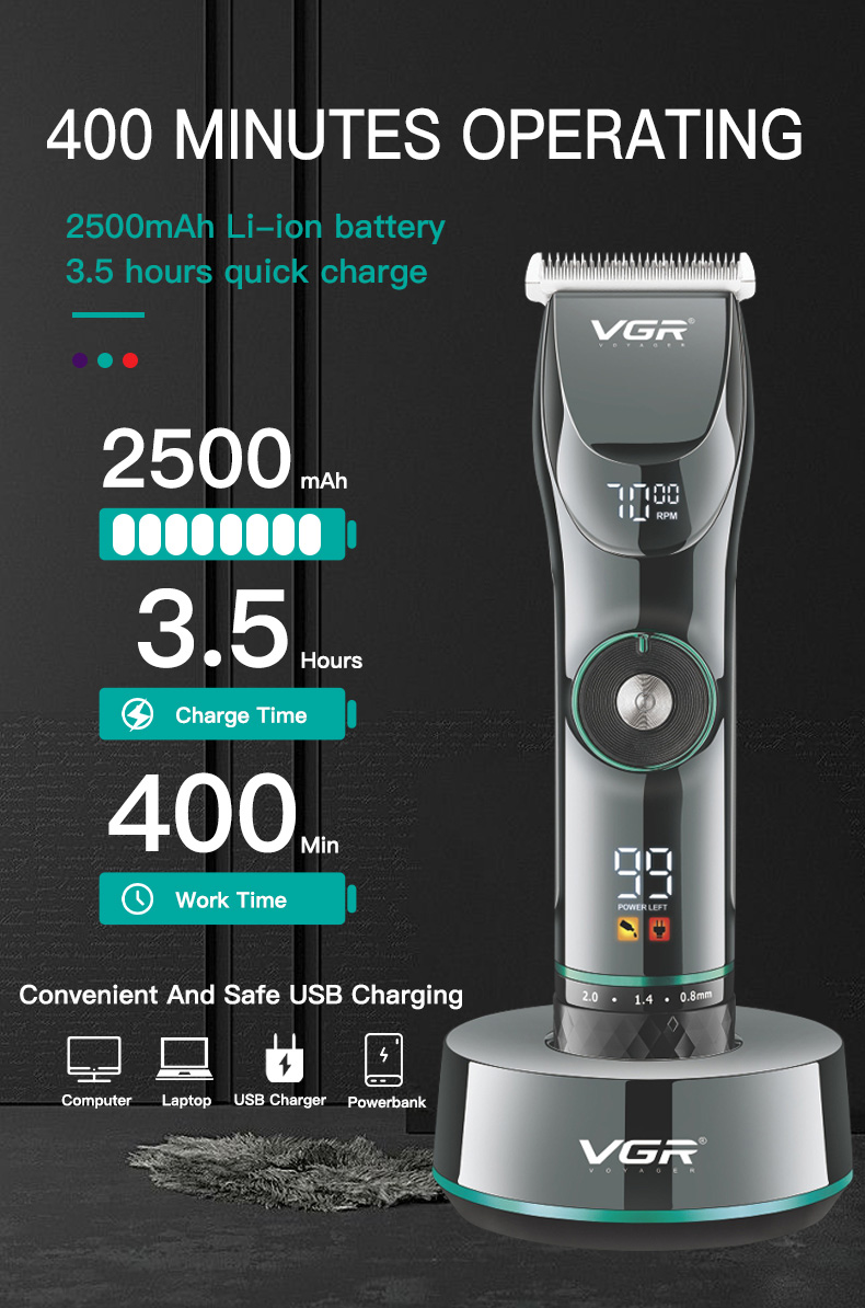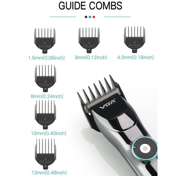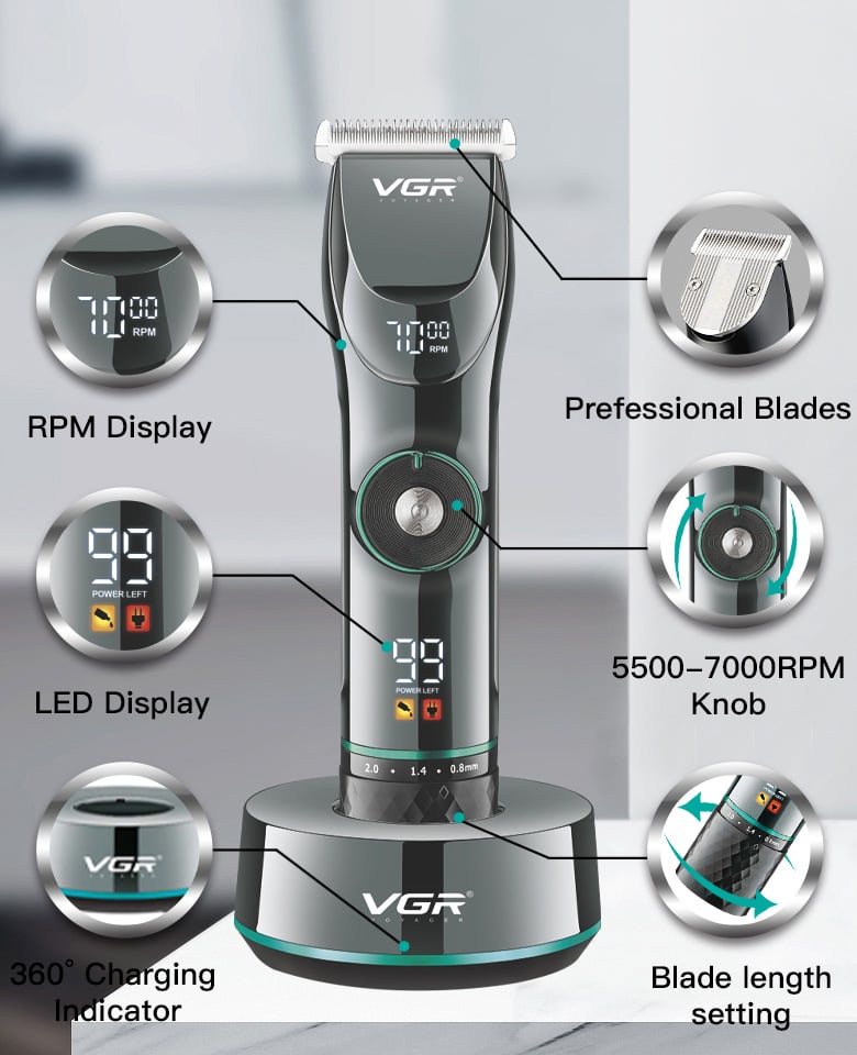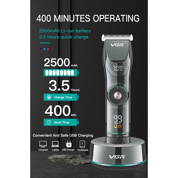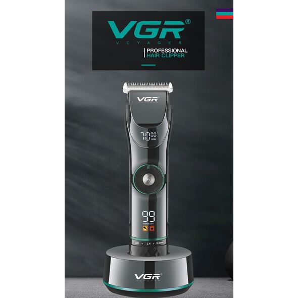 VGR Επαναφορτιζόμενη Επαγγελματική Κουρευτική Μηχανή 10W Ρυθμιζόμενου Μήκους Κοπής με 15 Ταχύτητες & LCD Οθόνη