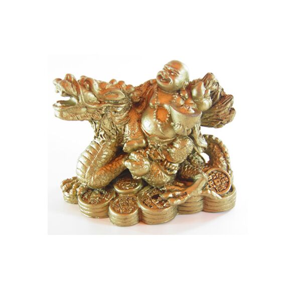 Ο συγκεκριμένος βούδας, κάθεται πάνω σε ένα δράκο, σύμβολο προστασίας, επιτυχίας και δύναμης και κρατάει πάνω του πολλούς θησαυρούς και σύμβολα πλούτου. Υπόσχεται απροσδόκητα κέρδη και αύξηση των εισοδημάτων σας, προστασία, δύναμη και τύχη στις επιχειρήσεις σας.