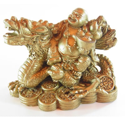 Ο συγκεκριμένος βούδας, κάθεται πάνω σε ένα δράκο, σύμβολο προστασίας, επιτυχίας και δύναμης και κρατάει πάνω του πολλούς θησαυρούς και σύμβολα πλούτου. Υπόσχεται απροσδόκητα κέρδη και αύξηση των εισοδημάτων σας, προστασία, δύναμη και τύχη στις επιχειρήσεις σας.