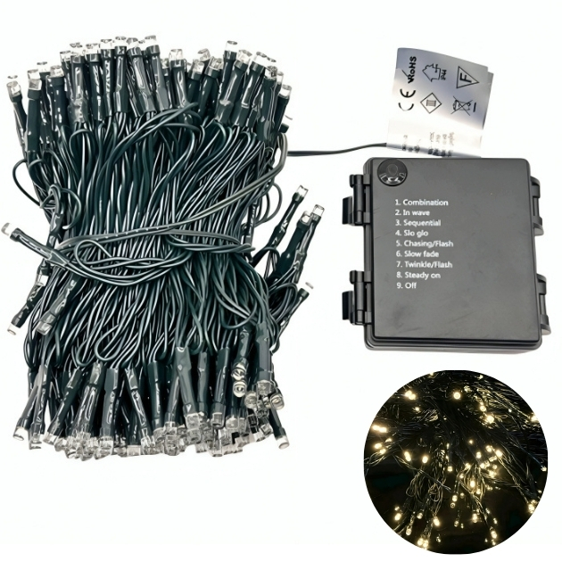 Πρόκειται για μια γιρλάντα 30 μέτρα που αποτελείται από 300 microLed λαμπάκια σε σειρά, όπου εκπέμπουν λευκό ψυχρό φωτισμό, με πράσινο καλώδιο.