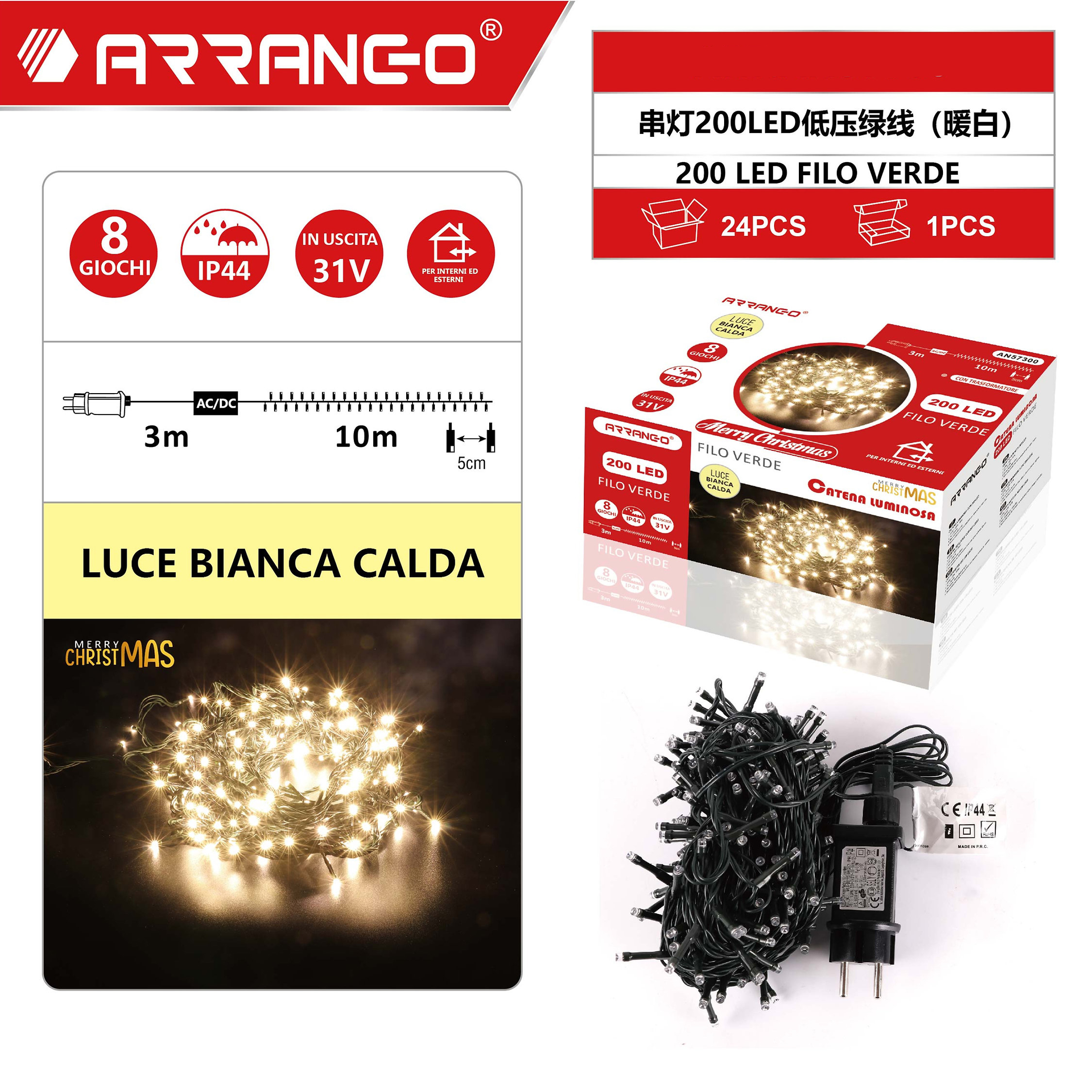 Πρόκειται για 10m λαμπάκια σε σειρά με πράσινο καλώδιο και 200 LED, όπου εκπέμπουν θερμό λευκό φωτισμό και 3m καλώδιο.