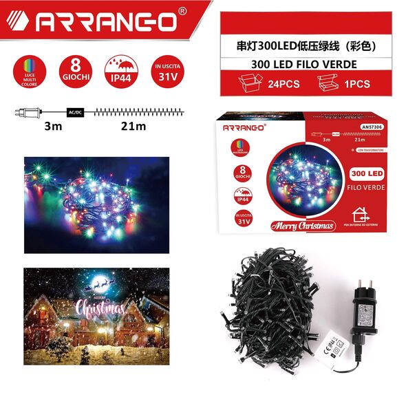 Πρόκειται για 21m λαμπάκια σε σειρά με πράσινο καλώδιο και 300 LED, όπου εκπέμπουν πολύχρωμο φωτισμό και 3m καλώδιο.