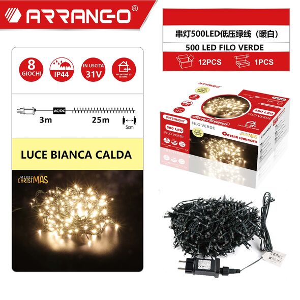 Πρόκειται για 25m λαμπάκια σε σειρά με πράσινο καλώδιο και 500 LED, όπου εκπέμπουν θερμό λευκό φωτισμό και 3m καλώδιο.