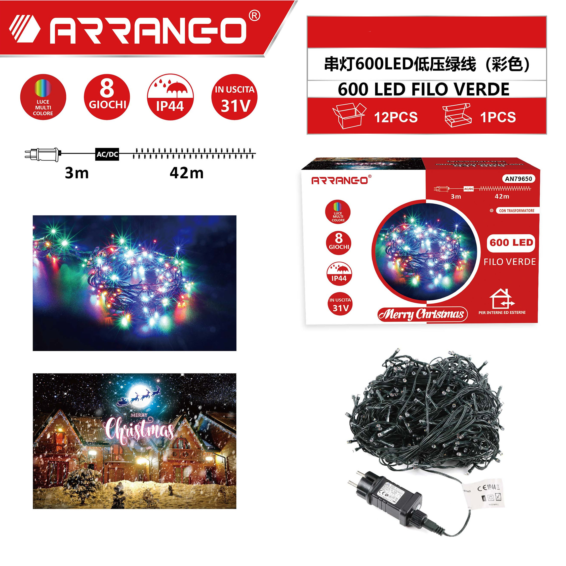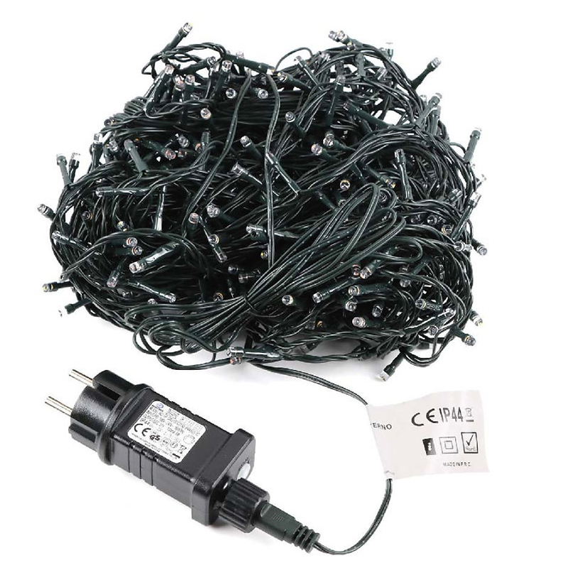 Πρόκειται για 42m λαμπάκια σε σειρά με πράσινο καλώδιο και 600 LED, όπου εκπέμπουν πολύχρωμο RGB φωτισμό και 3m καλώδιο.
