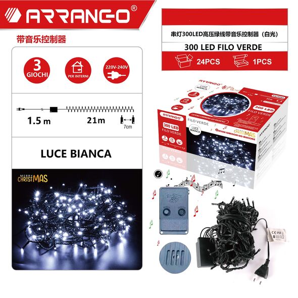 Πρόκειται για 21m πράσινο καλώδιο με 300 LED λαμπάκια σε σειρά όπου εκπέμπουν ψυχρό λευκό φωτισμό, με 7 εκατοστά απόσταση το καθένα μεταξύ τους και με 1.5m καλώδιο.