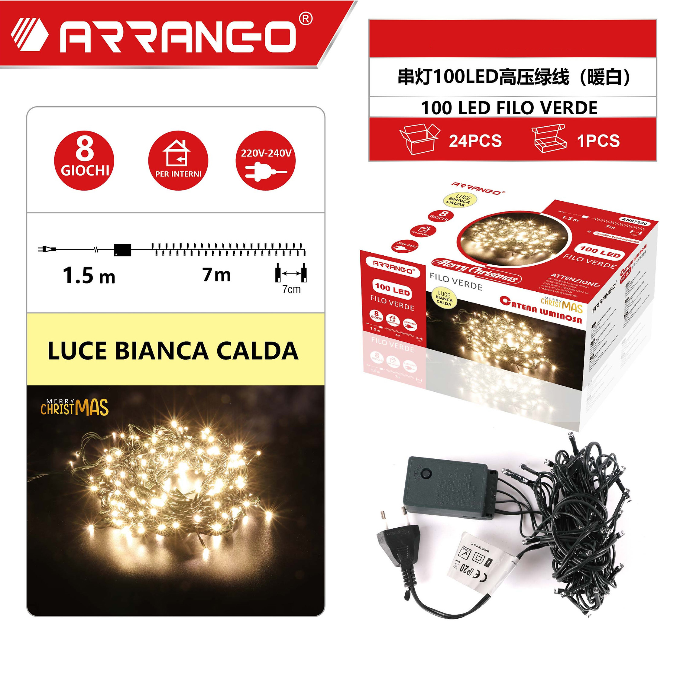 Πρόκειται για 7m με 100 LED λαμπάκια σε σειρά όπου εκπέμπουν θερμό λευκό φωτισμό, με 7 εκατοστά απόσταση το καθένα μεταξύ τους και με 1.5m καλώδιο.
