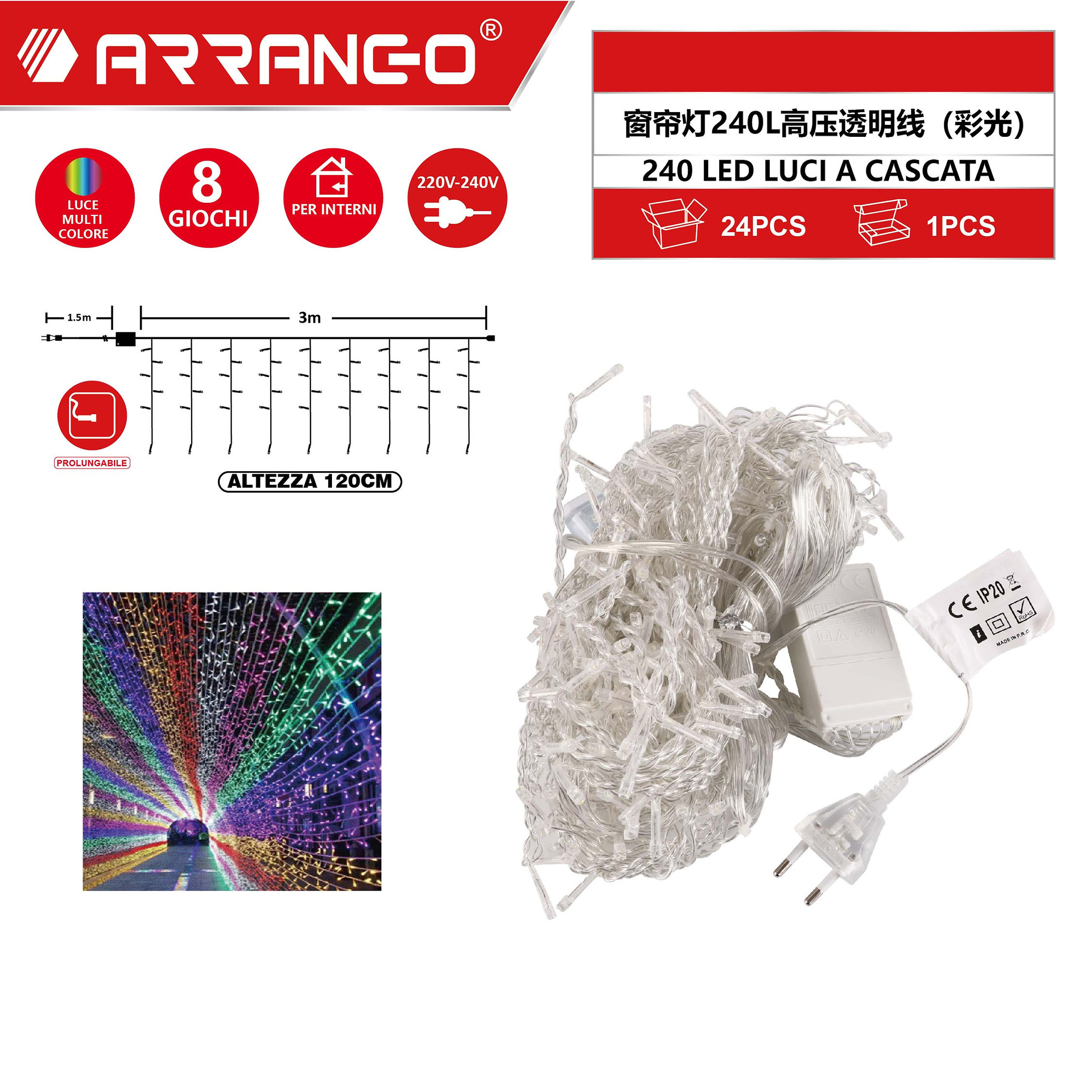 - 1 x Χριστουγεννιάτικα Λαμπάκια Κουρτίνα 4.5m 240 LED με Πολύχρωμο Φωτισμό & 8 Προγράμματα Arrango