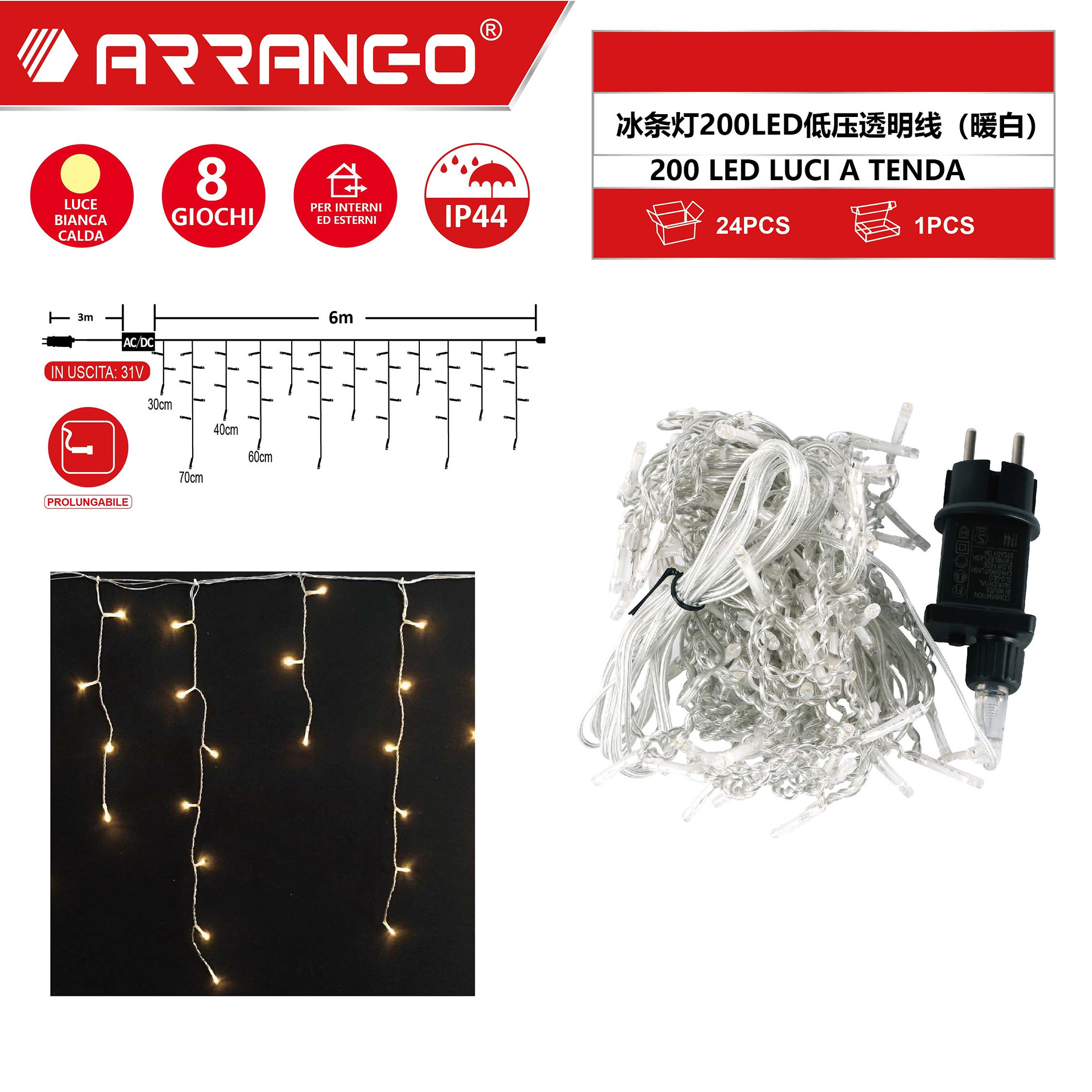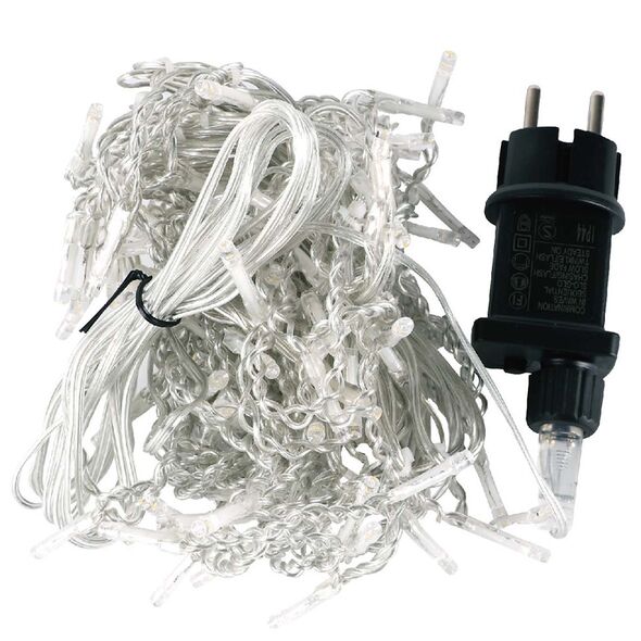 Πρόκειται για κουρτίνα με 6 μέτρα μήκος λαμπάκια που εκπέμπουν θερμό λευκό φωτισμό και 3 μέτρα καλώδιο διάφανο.