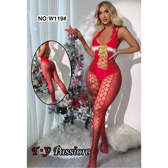 Γιορτινή, αισθησιακή ολόσωμη bodystocking σε έντονο κόκκινο, με fishnet σχέδιο που αγκαλιάζει το σώμα και τονίζει τις καμπύλες. Διαθέτει γούνινη λεπτομέρεια και φιόγκο στο στήθος για extra festive διάθεση. Ελαστική, άνετη και ιδανική για χριστουγεννιάτικες εμφανίσεις!