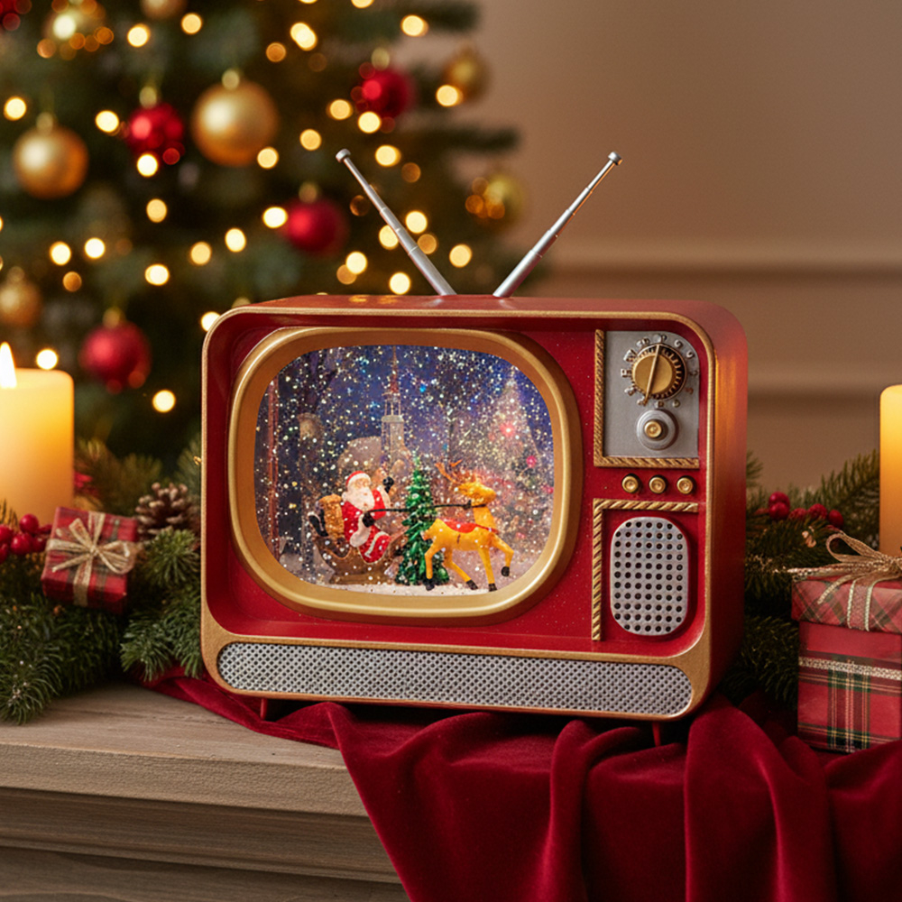 Το διακοσμητικό είναι κατασκευασμένο από ανθεκτική ρητίνη με λεπτομέρειες που θυμίζουν retro τηλεόραση, ενώ στο εσωτερικό του παρουσιάζει τρισδιάστατη χριστουγεννιάτικη σκηνή με τον Άγιο Βασίλη, έλκηθρο, δέντρο και φωτιζόμενο χιόνι που κινείται αδιάκοπα.