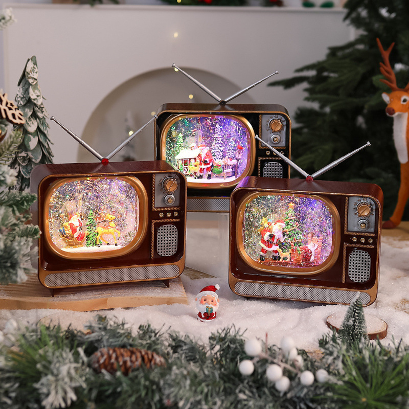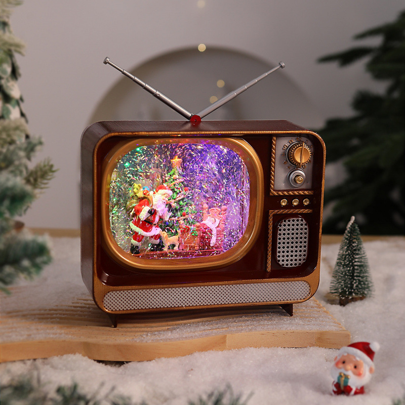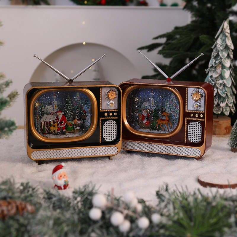 Vintage χριστουγεννιάτικο διακοσμητικό σε μορφή retro TV με LED φωτισμό, κινούμενη χρυσόσκονη και επιλογή μουσικής. USB ή μπαταρίες. Ιδανικό για σαλόνι, γραφείο ή ως γιορτινό δώρο.