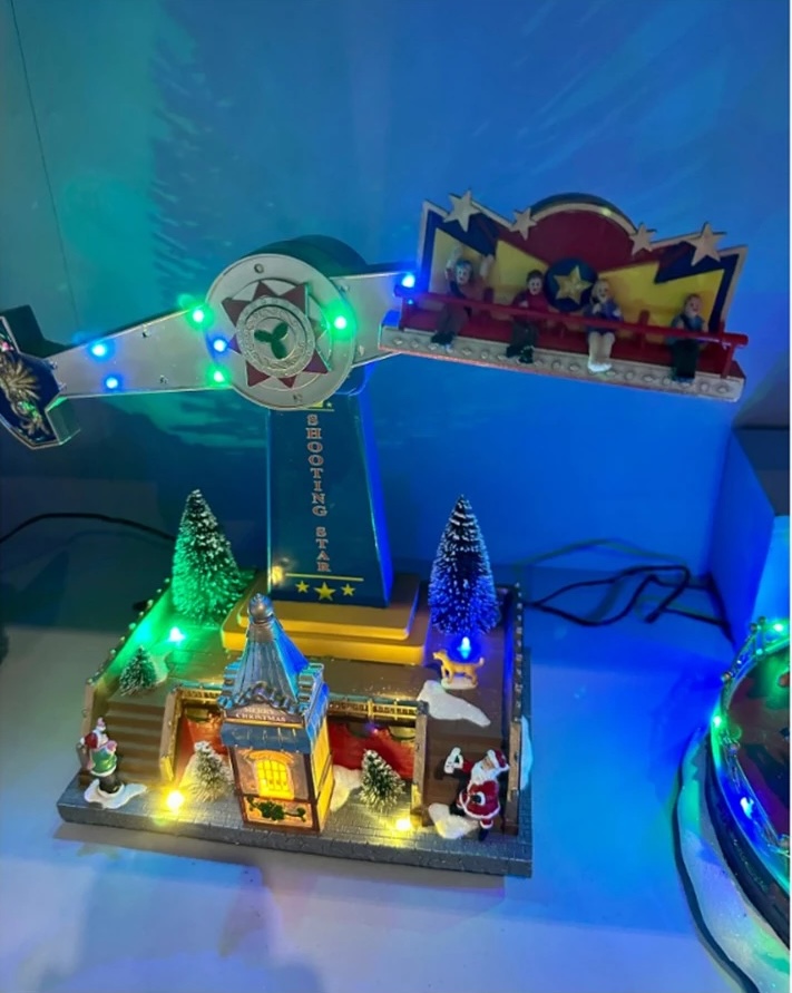 Οι πολύχρωμες λάμπες LED φωτίζουν τη σκηνή, ενώ οι κινούμενες φιγούρες δημιουργούν ένα ζωντανό θέαμα που θυμίζει παραδοσιακό λούνα παρκ.