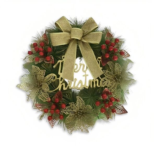 Χριστουγεννιάτικο Διακοσμητικό Στεφάνι Merry Christmas με Χρυσό Φιόγκο & Φυτά