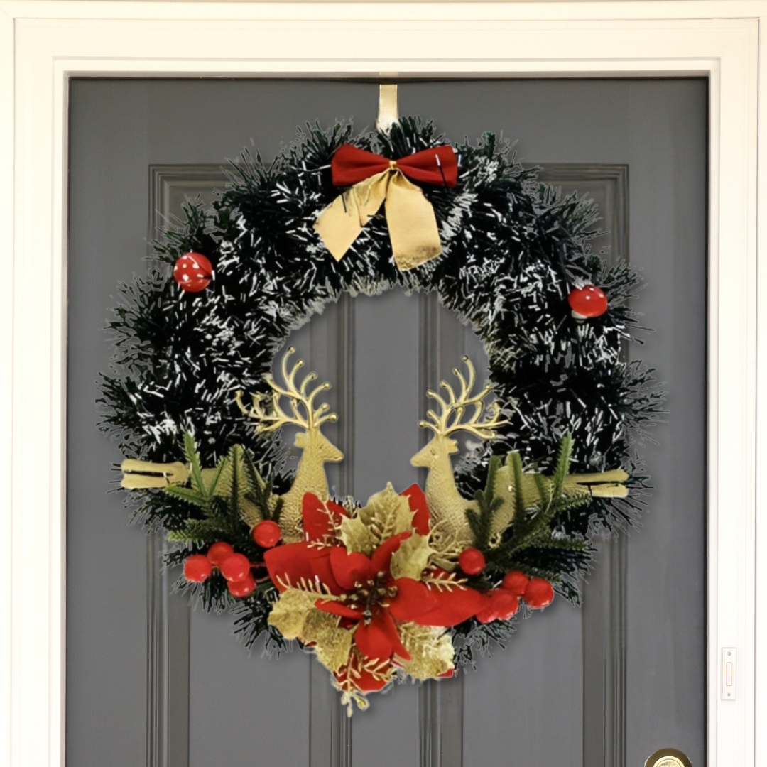 Χριστουγεννιάτικο Διακοσμητικό Στεφάνι Χιονισμένο με Ελάφια & Χρυσό Φιογκάκι