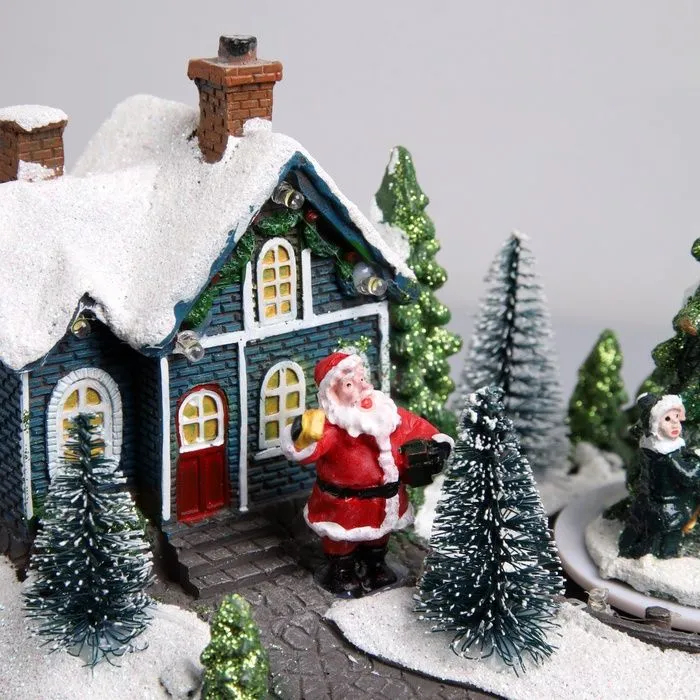 Φωτιζόμενο χιονισμένο χωριό με Άγιο Βασίλη, μουσική και περιστρεφόμενο δέντρο. Δημιουργεί μαγική ατμόσφαιρα με LED φωτισμό και ρεαλιστικές λεπτομέρειες. Ιδανικό για κάθε χριστουγεννιάτικη γωνιά.