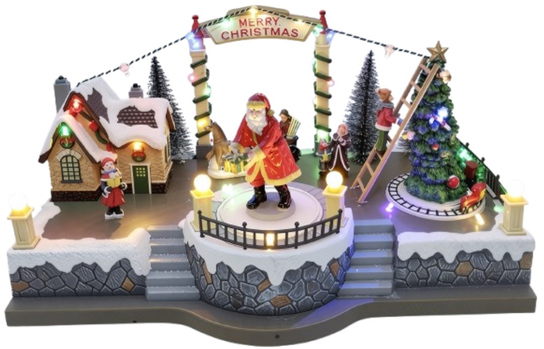 Ο Άγιος Βασίλης δεσπόζει στο κέντρο της σκηνής, περιτριγυρισμένος από στολισμένο δέντρο, σπιτάκι με φωτάκια και παιδικές φιγούρες που ολοκληρώνουν μια γιορτινή ατμόσφαιρα γεμάτη ζεστασιά και χαρά.