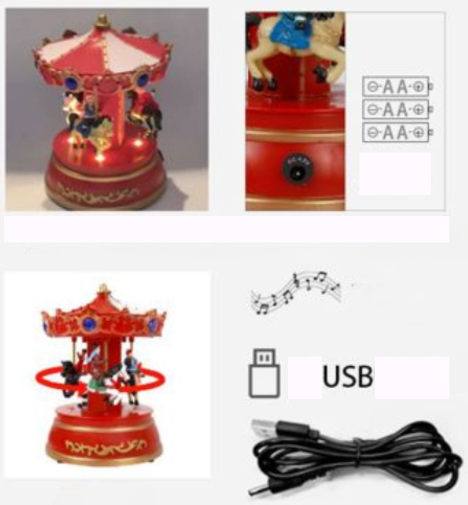Μπορεί να λειτουργήσει είτε με μπαταρίες είτε μέσω σύνδεσης USB, προσφέροντάς σας ευελιξία στη χρήση του. Κατά τη διάρκεια της λειτουργίας, οι φιγούρες περιστρέφονται συγχρονισμένα με τη μουσική, αναδεικνύοντας τη μαγεία των γιορτών.