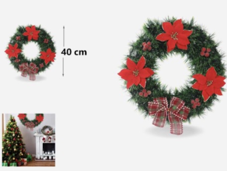 Το Χριστουγεννιάτικο στεφάνι με κόκκινα λουλούδια και διάμετρο 40cm αποτελεί ένα εντυπωσιακό διακοσμητικό για πόρτα, τοίχο ή τζάκι.