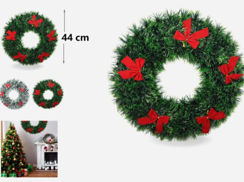 Το Χριστουγεννιάτικο στεφάνι με κόκκινες κορδέλες και διάμετρο 44cm είναι ένα κομψό και εντυπωσιακό διακοσμητικό για την πόρτα ή τον εσωτερικό σας χώρο.