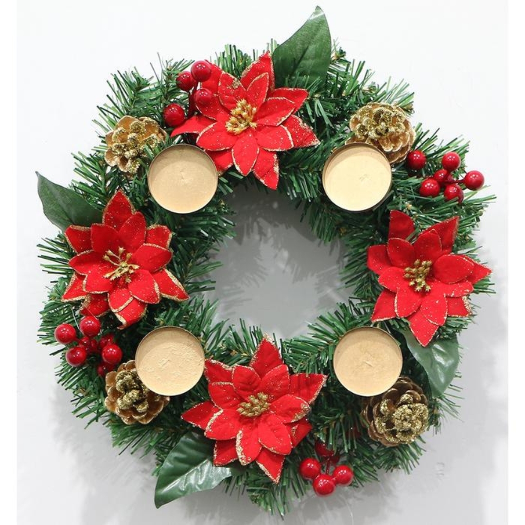 Χριστουγεννιάτικο Στεφάνι με Κόκκινα Λουλούδια και Θέσεις Κεριών 30cm