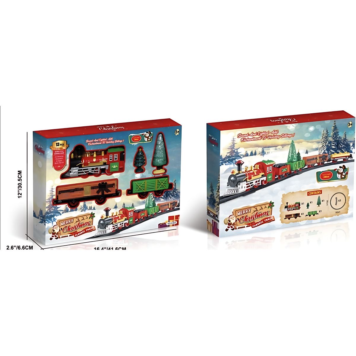 Το σετ περιλαμβάνει 13 τεμάχια, με πλήρη κυκλική ράγα διαμέτρου 90 cm, μηχανή με φως και ήχο, βαγόνια, καθώς και διακοσμητικά έλατα που ολοκληρώνουν τη χριστουγεννιάτικη σκηνή.