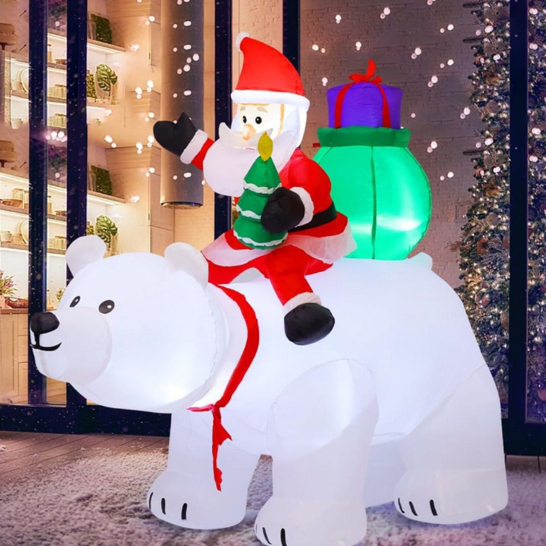 Φέρτε την πραγματική μαγεία των Χριστουγέννων στον χώρο σας με αυτόν τον εντυπωσιακό φουσκωτό Άγιο Βασίλη πάνω σε πολική αρκούδα.