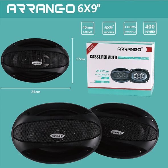 Ζεύγος ομοαξονικών ηχείων Oval της Arranco, 2 δρόμων 17x25cm ισχύος 400 Watt Max. Εξοπλισμένα με κωνικό Woofer 6x9" για πλούσια μπάσα και κωνικό Tweeter για καθαρές υψηλές νότες.